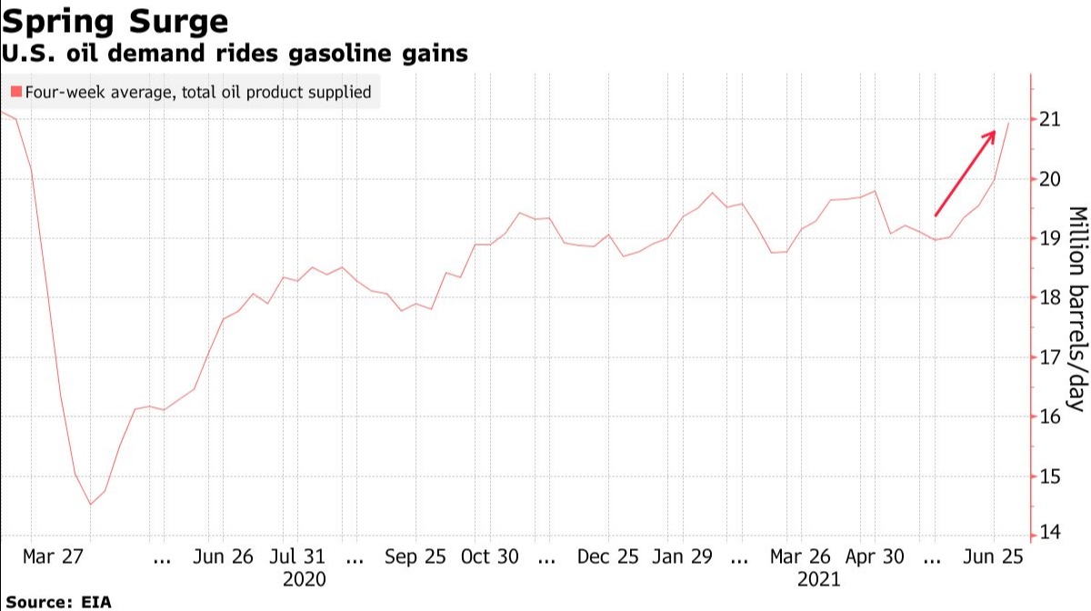 截至7月2日当周,美国石油产品供应总量的滚动平均值(衡量消费的指标)跳升至30年来的最高季节性水平。虽然汽油和柴油需求已恢复到疫情前的水平,塑料、沥青、润滑油和其他工业需求等产品的石油使用量激增,推动了经济复苏。