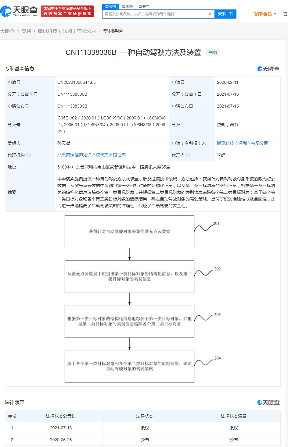 智通财经APP获悉,天眼查App显示,7月13日,腾讯科技(深圳)有限公司获得“一种自动驾驶方法及装置”专利授权,公告号CN111338336B,申请日期为2020年2月。