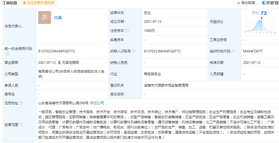 智通财经APP获悉,据天眼查显示,7月12日,阿里巴巴数字农业(山东)有限公司成立,注册资本1000万,经营范围包括智能农业管理、农业生产托管服务、园区管理服务等。股权穿透信息显示,该公司由阿里巴巴(上海)有限公司间接全资持股。