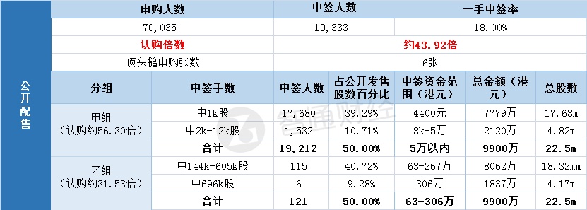 其中,公开配售申购人数70035人,一手中签率18%,认购倍数约43.92倍。