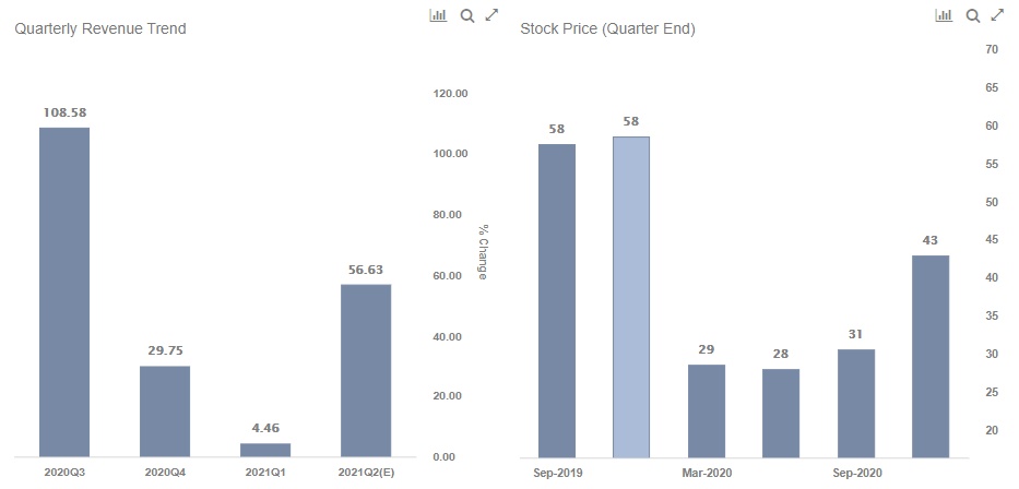 达美航空股票自2020年2月的58美元左右下跌至2020年3月的22美元左右,这意味着该股股价从疫情前的高点下跌了62%。随着限制措施的放松,该股股价已经从22美元的低位翻了一倍多,达45美元。鉴于航空旅行需求的回暖,Trefis预计该股股价还有更大的增长空间。