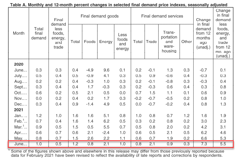 最终需求减少的食品、能源和贸易服务价格6月份上涨0.5%,5月份上涨0.7%。截至6月的12个月,食品、能源和贸易服务的最终需求指数上升了5.5%,这是自2014年8月首次计算12个月数据以来的最大涨幅。
