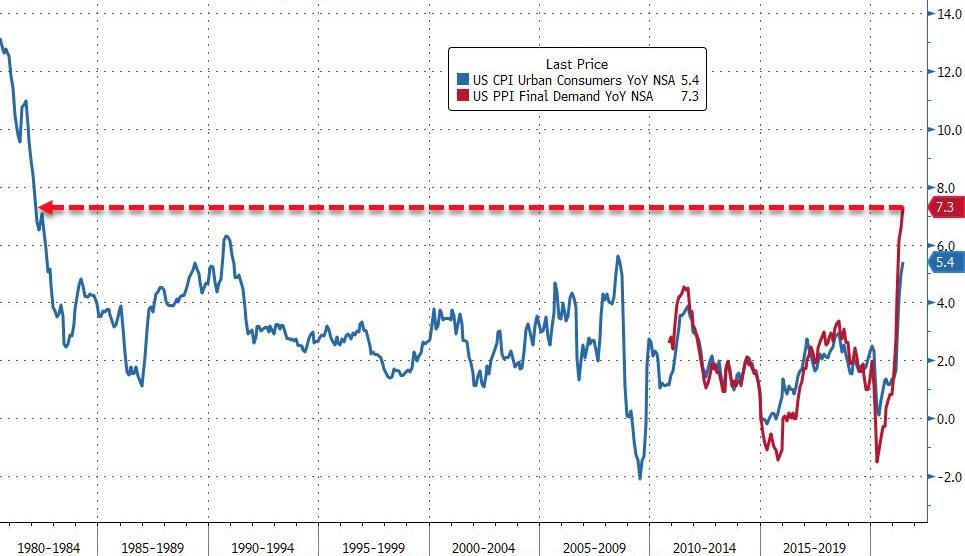 智通财经APP获悉,美国劳工部(Labor Department)周三公布,经季节性调整后,6月份生产者价格指数(PPI)环比增长1.0%,5月和4月分别上涨0.8%和0.6%。在未经调整的基础上,6月PPI同比上涨7.3%,为2010年11月首次计算以来的最大涨幅,预期值为6.7%。