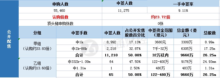其中,公开配售申购人数55460人,一手中签率9.11%,认购倍数约23.72倍。