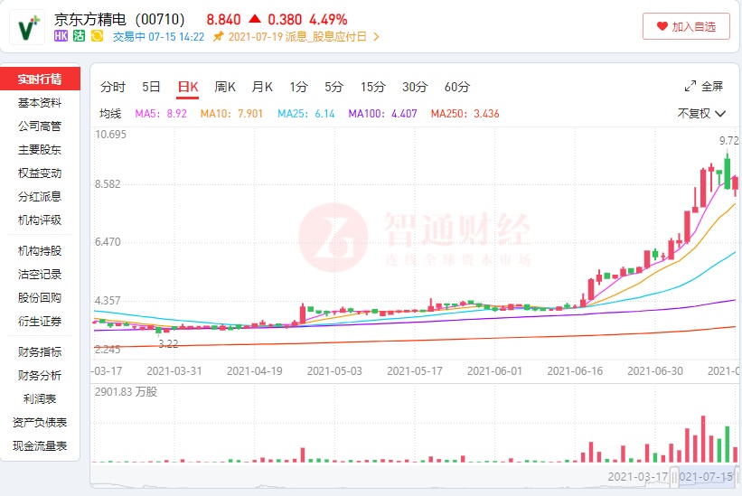 7月13日,京东方精电(00710)发布业绩盈喜公告称,公司预期中期股东应占溢利大幅增加不少于400%,经过计算,公司2021年上半年的净利润约为9100万元(港元,下同)。