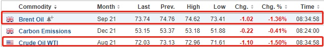 截至发稿,WTI原油跌1.50%,报72.03美元/桶。布伦特原油跌1.36%,报73.74美元/桶。