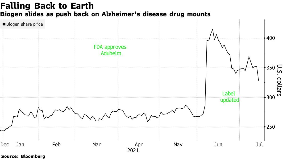 这家生物科技公司的股价周四下跌6.79%至328.16美元,创下6月4日以来的最低水平,并且是去年11月9日以来的最大跌幅。此前克利夫兰诊所、纽约市西奈山医疗系统和蓝十字与蓝盾协会都拒绝使用Aduhelm。即使有咨询组反对该药物,但美国食品与药品管理局(FDA)还是在6月7日批准了该药物。