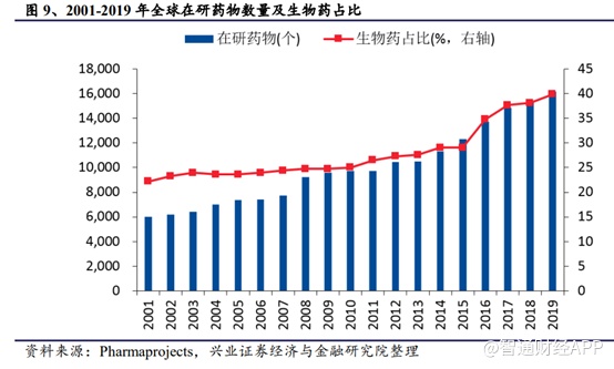 CRO的本质是药物研发环节从药企转移到CRO公司,故而药企的研发支出和外包率水平直接决定了行业景气度。纵观近20年的数据,全球在研药物数量持续上升,其中又以生物药增长更快,表现为在研药物中生物药占比的持续提升。生物药研发力度的加大推动了相关领域研发支出的增长。