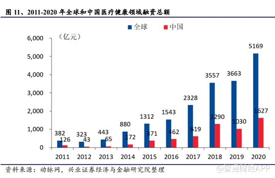 目前,绝大多数小型研发型药企在成长早期尚无产品上市销售,药物研发是最主要的经营活动,且一级市场的股权融资是最主要研发资金来源。最近10年国内外医疗健康领域的融资额均持续快速增长,为相关企业的研发活动提供了资金支持。