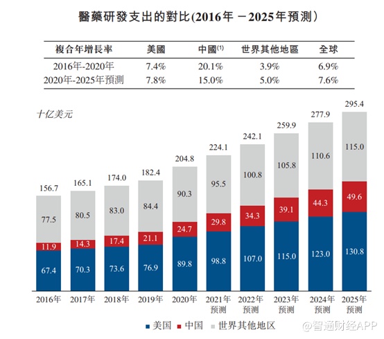 在药物研发需求增长、资金支持力度加大等多个因素的共同作用下,药物(尤其是生物药)研发支出快速增加。美国等发达国家医药行业起步较早,目前已发展较为成熟,研发支出基数大,增速并不快;而中国医药行业与美国还存在较大差距,尤其在创新药方面,但近年来国内医药行业积极由仿制向创新转型,研发支出快速增长,增速远高于全球平均水平。