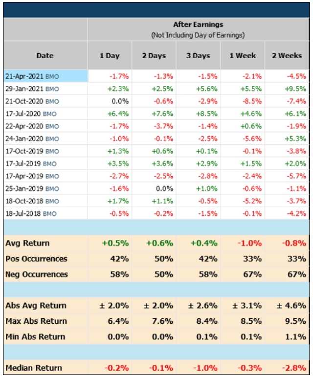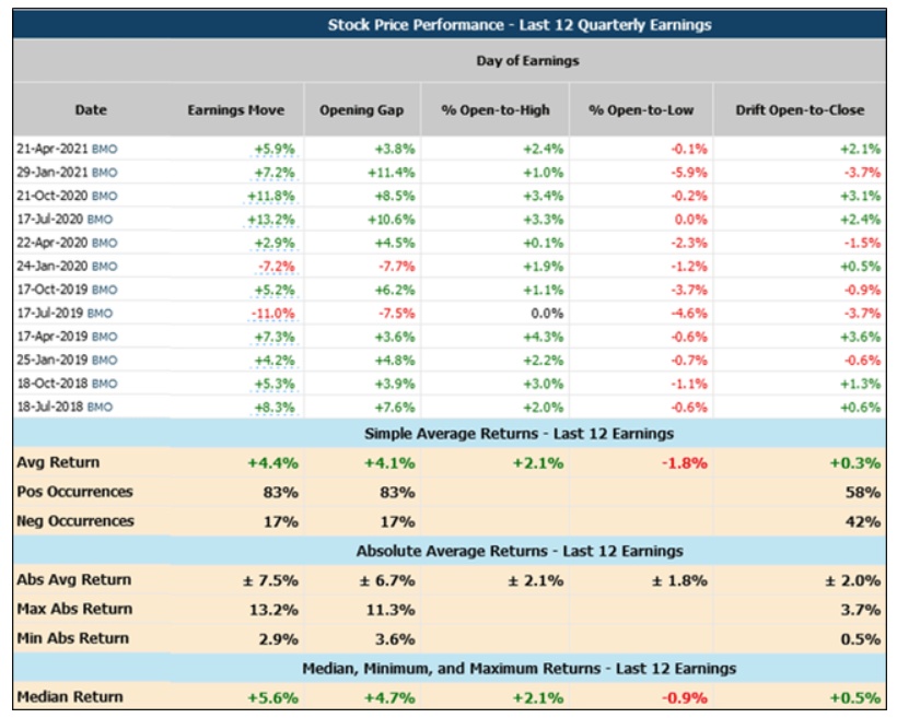 在过去的12个季度业绩公布日期间,83%的时间里,该股均出现显著的上涨,当日的回报率中值为+5.6%。