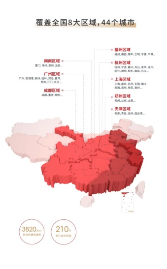 资料显示,融信服务以“深耕城市,区域运营”为核心,全国化战略布局,重点深耕海西经济圈、长三角经济圈并迅速扩展至全国其他区域。服务项目主要分布在福州、闽南、杭州、上海、郑州、成都、天津、广州八大区域的40余个城市。