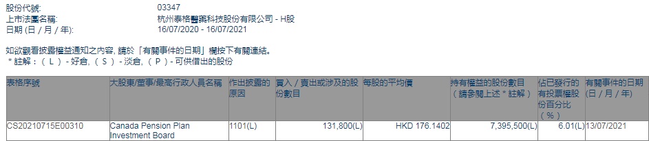 智通财经APP获悉,香港联交所最新资料显示,7月13日,Canada Pension Plan Investment Board增持泰格医药(03347)13.18万股,每股作价176.1402港元,总金额约为2321.5278万港元。增持后最新持股数目约为739.55万股,最新持股比例为6.01%。