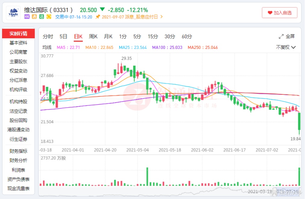 令人唏嘘的是维达这份中期业绩答卷,引发投资者不满,公司股价在7月16日跌幅一度达到15%。自2020年7月13日的高点31.72元,到2021年7月16日的低点19.84元,维达股价一年内最大回撤幅度已接近4成。