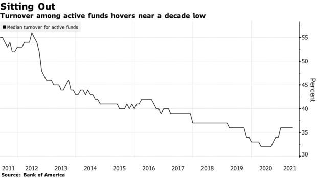 从理论上讲,现在应该是选择股票的好时机,因为疫情暴露了企业的强弱。然而,基金经理们基本上还是原地不动。他们的营业额中值,即股票买卖占资产的百分比,去年跌至十年来的最低点,并一直保持在40%以下。根据美国银行的数据,2012年的营业额中值达到56%的峰值。
