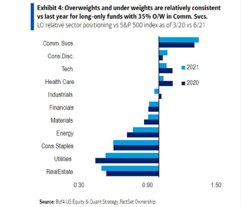主动型基金经理仍然偏爱稳定增长的股票而不是廉价股票,并且正在避开银行和能源等经济敏感型股票,就像他们在2020年3月市场暴跌期间所做的那样。美国银行统计的数据显示,除了对工业企业的厌恶情绪与日俱增之外,基金经理在各个行业的偏好几乎与近16个月前相同。事实上,几乎四分之三同样受人追捧的股票仍留在他们的投资组合中。