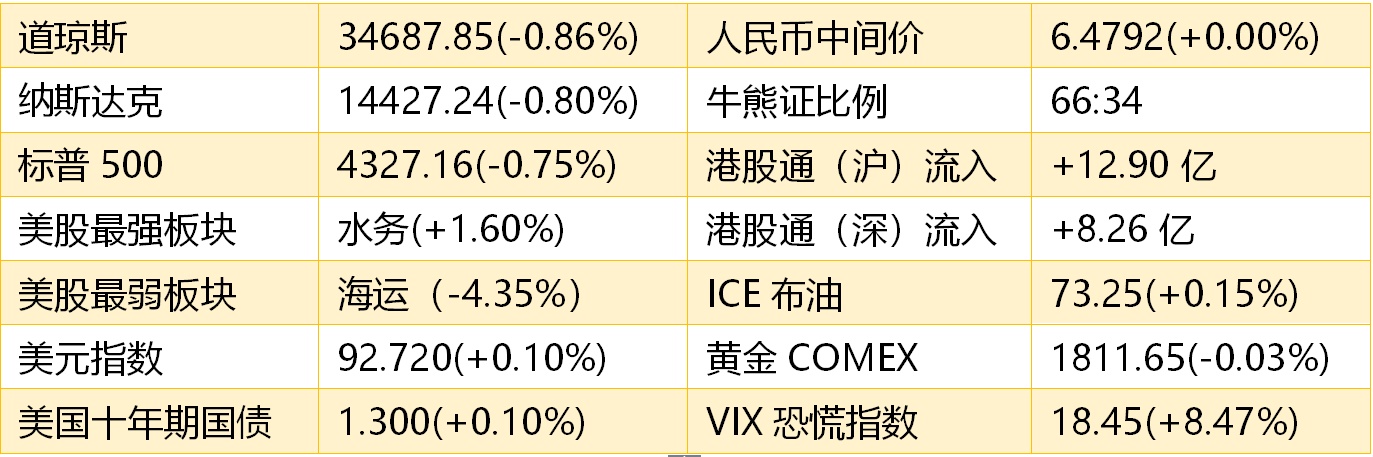 1、上周五美股截至收盘,道琼斯指数跌299.17点,跌幅0.86%,报34687.85点;标普500指数跌32.87点,跌幅0.75%,报4327.16点;纳斯达克综合指数跌115.9点,跌幅0.8%,报14427.24点。上周,道指累跌0.52%,标普500指数累跌0.97%,纳指累跌1.87%。港股ADR指数下跌,按比例计算,收报27759点,下跌245.23点或0.88%。