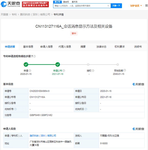 智通财经APP获悉,据天眼查App显示,7月16日,腾讯科技(深圳)有限公司公开一项“会话消息显示方法及相关设备”发明专利,公开号CN113127116A,申请日期为2020年1月。