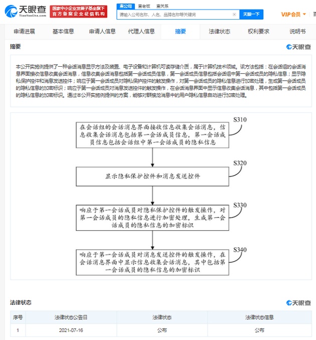 专利摘要显示,本公开实施例方法包括在会话消息界面中显示信息收集会话消息,其中包括第一会话成员的隐私信息的加密标识等。通过本公开实施例提供的方案,能够对群接龙消息中的用户隐私信息自动进行加密处理。