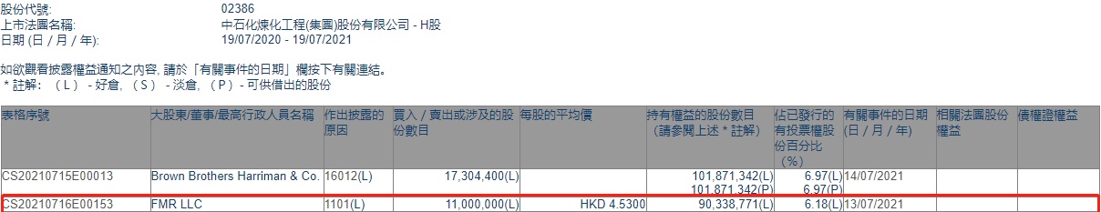 智通财经APP获悉,香港联交所最新资料显示,7月13日,FMR LLC增持中石化炼化工程(02386)1100万股,每股作价4.53港元,总金额为4983万港元。增持后最新持股数目约为9033.88万股,最新持股比例为6.18%。