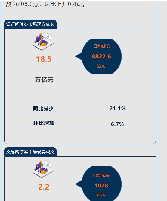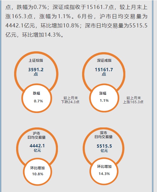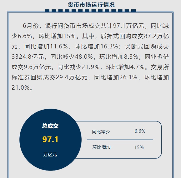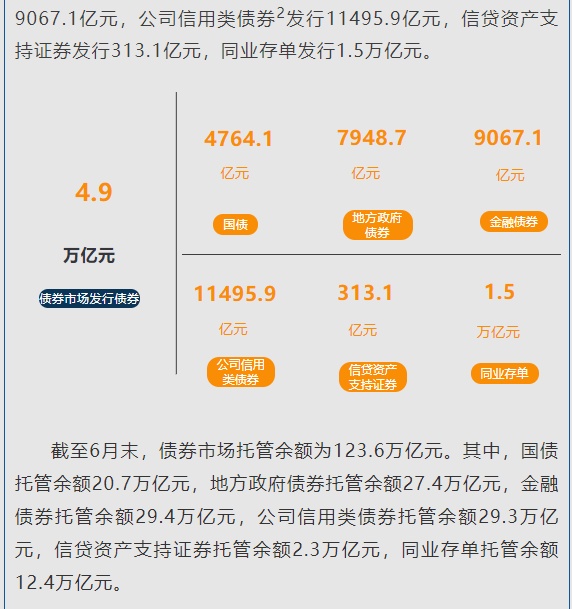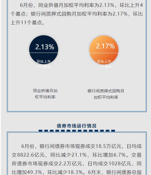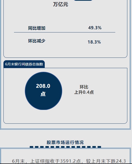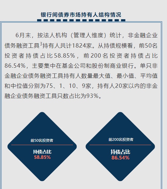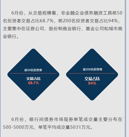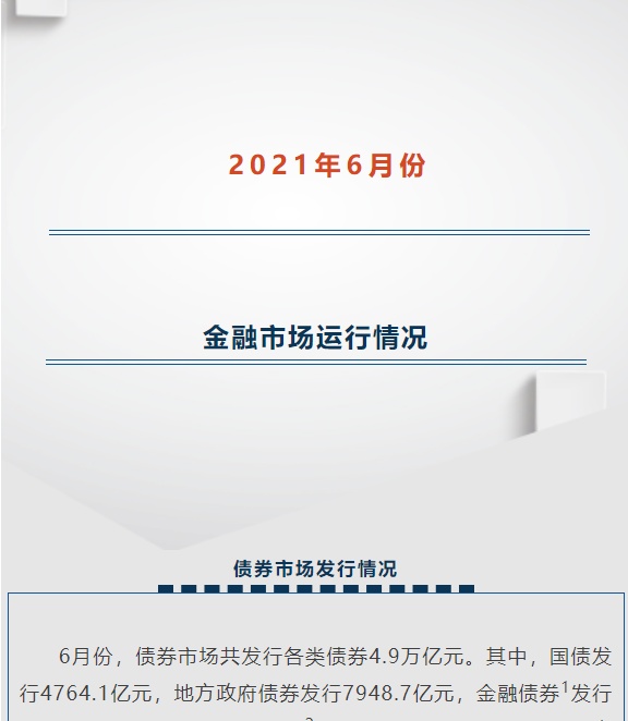 智通财经APP获悉,中国人民银行在其微信公众号上发布《2021年6月份金融市场运行情况》一文,文中提到,今年6月份我国金融市场运行情况,具体来看:6月份,债券市场共发行各类债券4.9万亿元,债券市场托管余额为123.6万亿元;6月份,银行间货币市场成交共计97.1万亿元,同比减少6.6%,环比增加15%;6月末,上证综指收于3591.2点,较上月末下跌24.3点,跌幅为0.7%;深证成指收于15161.7点,较上月末上涨165.3点,涨幅为1.1%。6月末,按法人机构(管理人维度)统计,非金融企业债务融资工具持有人共计1824家。从持债规模看,前50名投资者持债占比58.85%,前200名投资者持债占比86.54%,主要集中在基金公司和股份制商业银行。