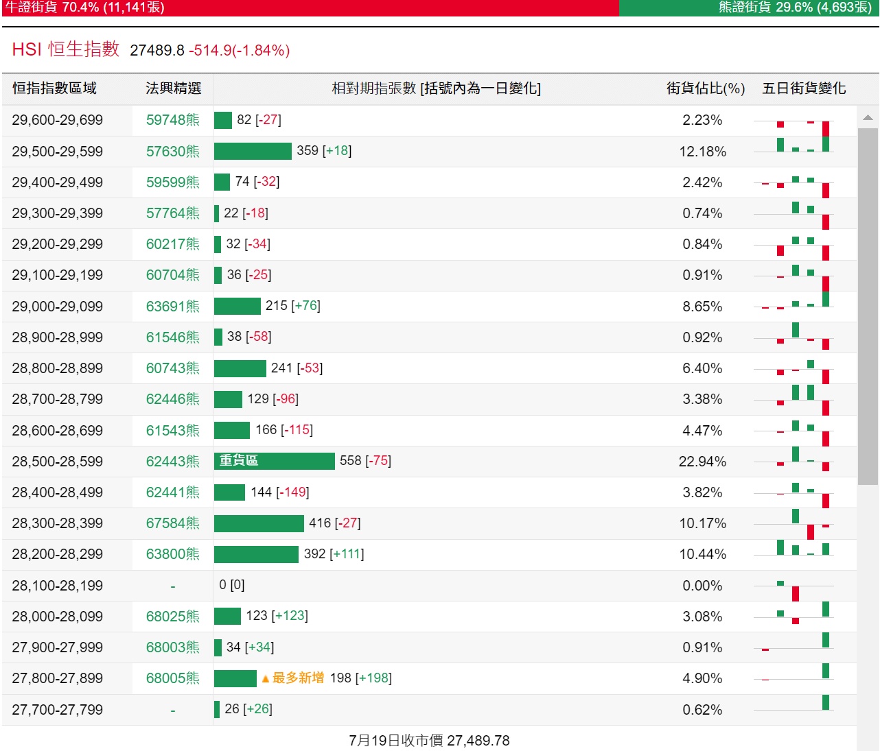 智通财经APP获悉,截至7月20日,恒指最新的牛熊街货比例为70:30。