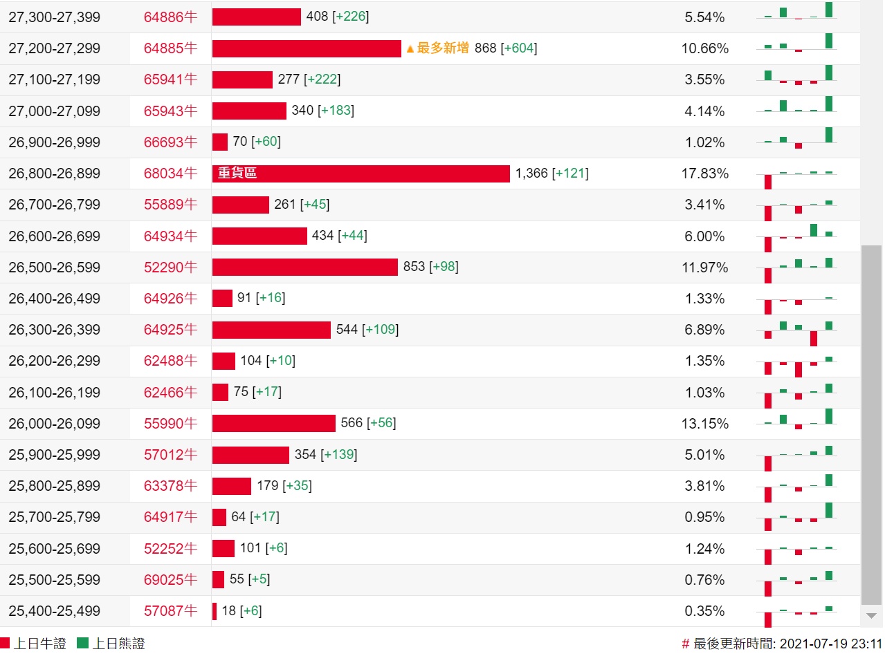 牛证街货重货区在26800-26899区间,该区间最新牛证数量为1366张,较上一交易日增加121张;最多新增在27200-27299区间,该区间最新牛证数量为868张,较上一交易日增加604张。