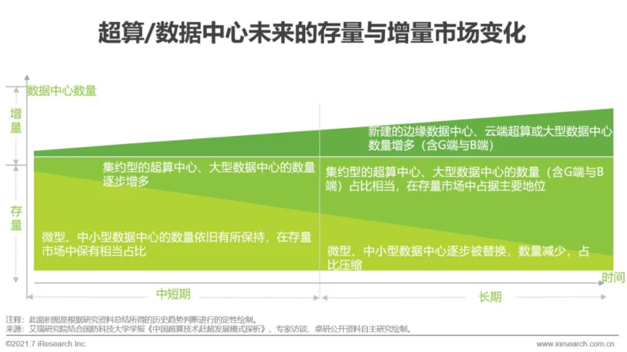 而从市场变化趋势来看,可分为:1)存量市场:微型、中小型数据中心会逐渐被改造为集约型的大型数据中心,符合节能减排相关标准、机柜数量与异构组合增多的集约型超算/数据中心将在存量市场中占据主流。2)增量市场:边缘计算数据中心与云端超算或大型数据中心。未来,边缘计算的发展会催生出更适宜边缘计算场景的算力集群异构设计,其异构化程度将会高于传统的数据中心,异构设计的突破将会进一步提高端-边-云的整体计算效能,进而加速AI模型的训练与推理。