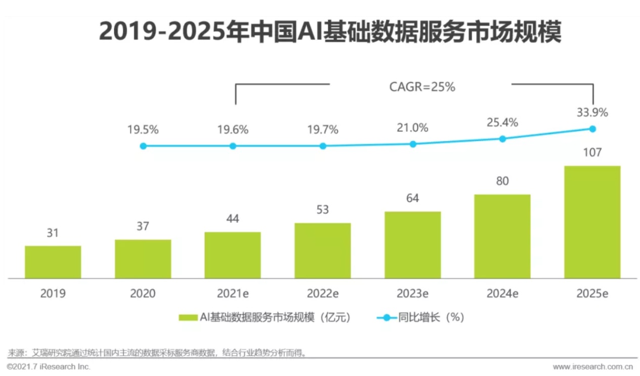人工智能基础数据服务是指为各业务场景中的AI算法训练与调优而提供的数据库设计、数据采集、数据清洗、数据标注与数据质检服务。2020年我国AI基础数据服务市场规模(含数据采集与标注)为37亿元,到2025年,相应规模可达到107亿元,整体增速呈现稳步提升的趋势。从市场细分收入结构来看,图像类与语音类收入占总收入规模的88.8%,是业务的主要构成部分;图像类与语音类收入基本持平,图像类业务以智能驾驶与安防为主。