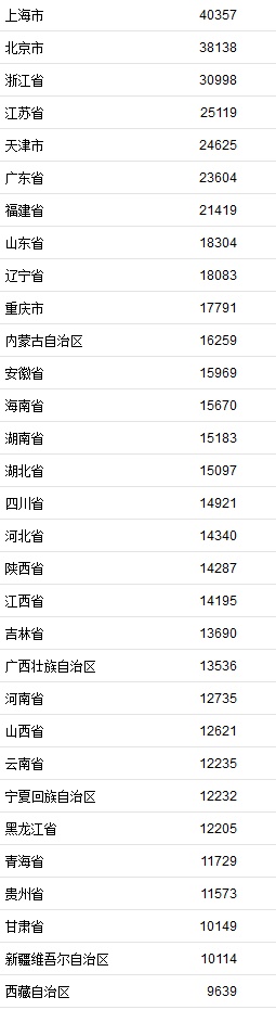 在31省份人均可支配收入数据中可以看到,上海、北京、浙江位居前三。其中,上海上半年居民人均可支配收入达到了40357元,位居全国第一名,同时,上海也是上半年仅有的人均可支配收入超过4万元的地区。此外,北京上半年居民人均可支配收入38138元,居全国第二。浙江位居第三,其上半年居民人均可支配收入30998元。
