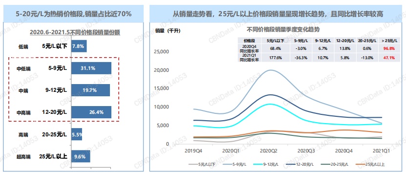 据相关研报数据显示,从销量走势来看,目前25元/L以上超高端产品呈快速增长趋势,且同比增长率相对较高。而5-20元/L的中端啤酒虽然是主力,销量占比近70%,但增长状态却呈明显的放缓态势,不是个位数增速,就是维持“负增长”状态。
