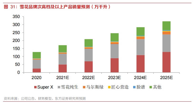 而据东方证券预计,随着该公司持续加大高端产品营销和资源支持力度,华润啤酒的高端势能将逐渐形成,综合预计,2021年至2025年,雪花品牌次高档及以上产品销量CAGR约为20%,至2025年销量达到321万千升,占总体销量的比重达到26%。