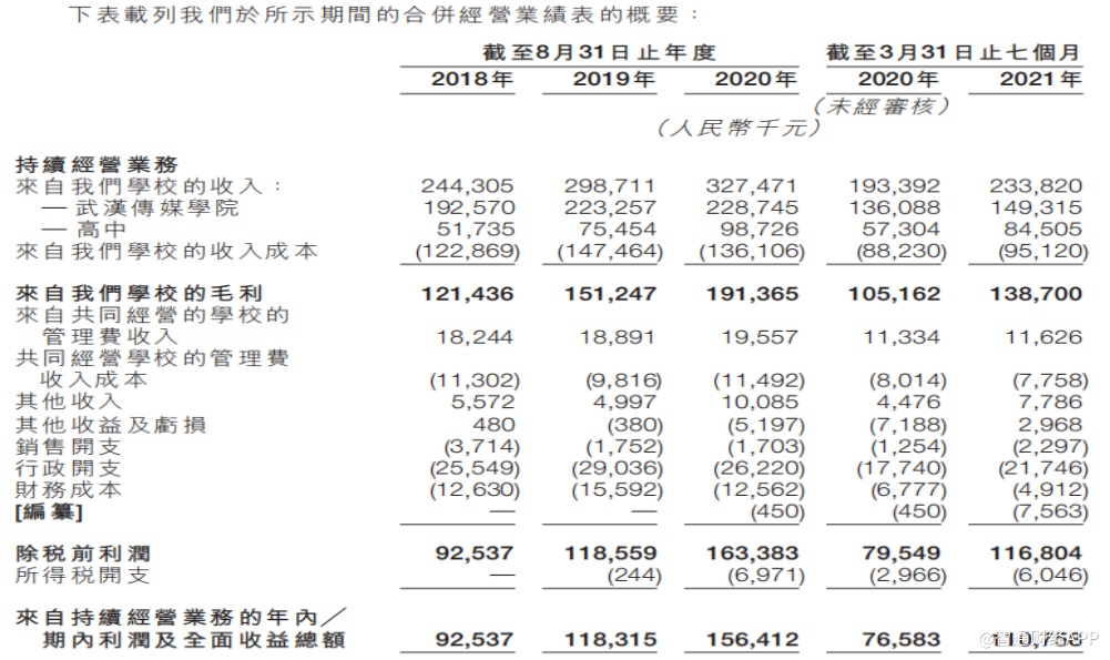 业绩方面,截至2018年、2019年及2020年8月31日止年度以及截至2021年3月31日止七个月,天有教育的总收益分别为2.63亿元(人民币,下同)、3.18亿元、3.47亿元和2.45亿元,同期的利润及全面收益总额分别为9250万元、1.18亿元、1.56亿元及1.11亿元。
