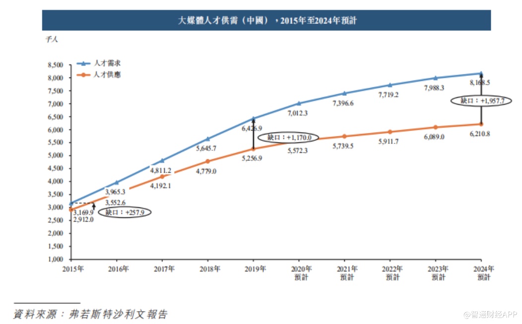 中国大传媒行业的发展带动人才需求迅速增加,超过人才供应增加的速度,导致该行业的人才供需缺口由2015年的约30万人扩大至2019年的约120万人。预计到2024年大传媒行业人才需要将达到约820万人。然而,由于针对中国大传媒行业的培训及教育能力有限,人才供应预计将继续落后于快速的需求增长。根据弗若斯特沙利文报告,基于目前能力及培训及教育能力的历史增长速度,人才供需缺口预计于2024年将达到约200万人。