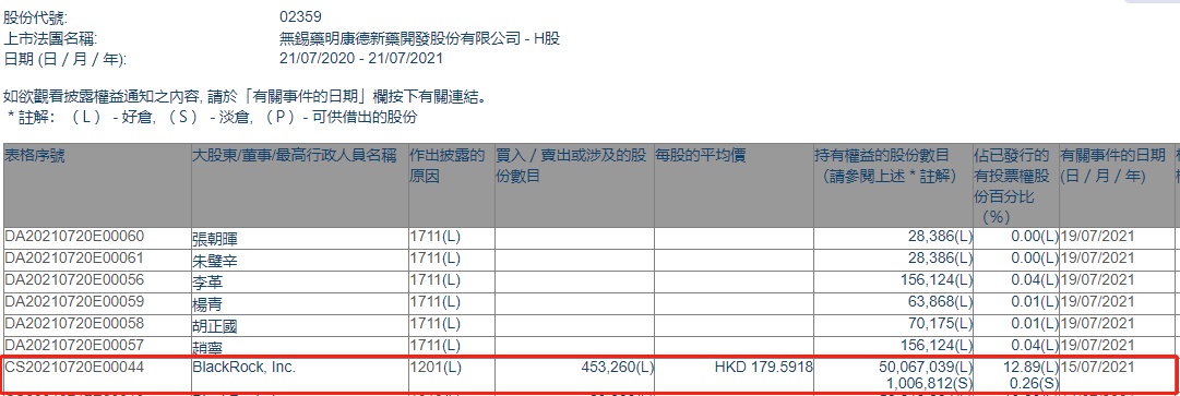 智通财经APP获悉,香港联交所最新资料显示,7月15日,贝莱德减持药明康德(02359)45.326万股,每股作价179.5918港元,总金额约为8140.18万港元。增持后最新持股数目约为5006.70万股,最新持股比例为12.89%。