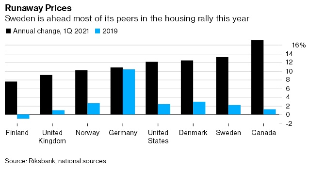 瑞典房地产价格上涨反映了从加拿大到新西兰的楼市繁荣,同时,在过去一个月,这些国家也被彭博经济(Bloomberg Economics)评为全球房地产泡沫最大的市场。这种形势正促使某些国家货币当局提高利率,但瑞典央行却在关注通胀目标时不愿作出行动,并将注意力转向其他选择。