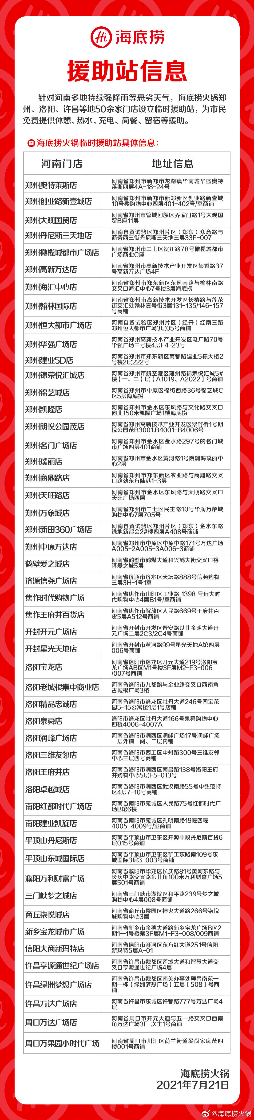 据中央气象台预计,未来三天,河南省仍有降雨,中央气象台7月21日10时继续发布暴雨橙色预警。为支持抢险救援工作的开展,海底捞火锅郑州、洛阳、许昌、安阳、南阳、焦作等50多家门店将免费向市民开放,设立临时援助站,并根据门店实际情况提供休憩、热水、充电、简餐、留宿等服务。