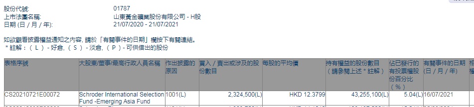 智通财经APP获悉,香港联交所最新资料显示,7月16日,Schroder International Selection Fund -Emerging Asia Fund 增持山东黄金(01787)232.45万股,每股作价12.3799港元,总金额约为2877.71万港元。增持后最新持股数目为4325.51万股,最新持股比例为5.04%。