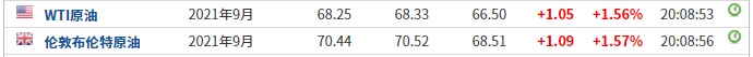 截至发稿,WTI原油涨1.56%,报68.25美元/桶。布伦特原油涨1.57%,报70.44美元/桶。