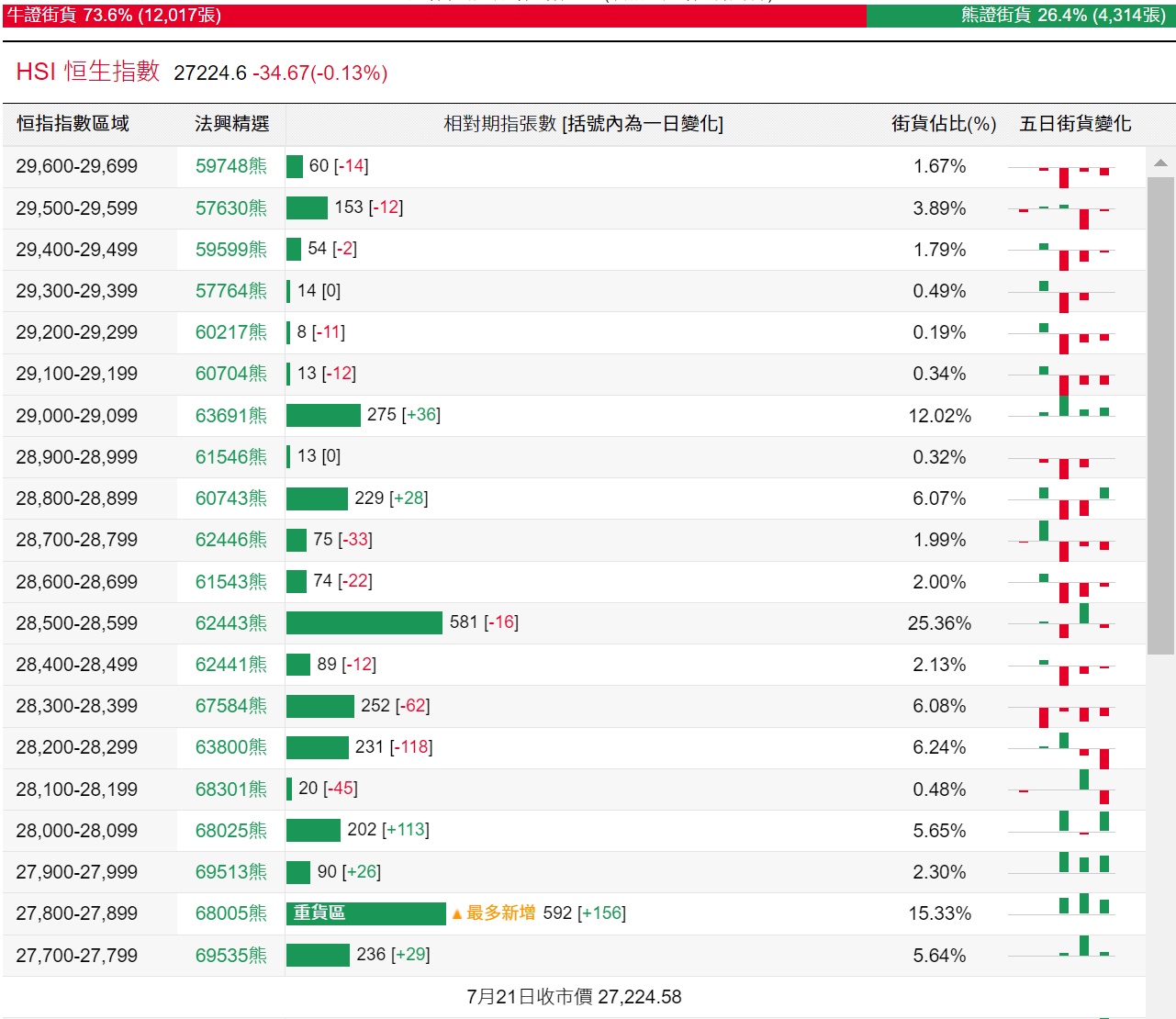 法兴恒指牛熊证街货分布图中的数据显示,熊证街货重货区在27800-27899区间,该区间最新熊证数量为592张,较上一交易日增加156张;最多新增也在该区间;