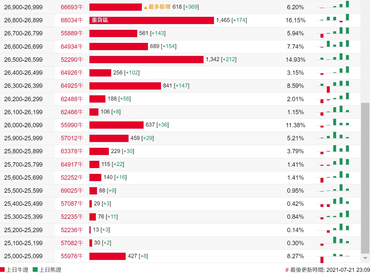 牛证街货重货区在26800-26899区间,该区间最新牛证数量为1465张,较上一交易日增加174张;最多新增在26900-26999区间,该区间最新牛证数量为618张,较上一交易日增加369张。