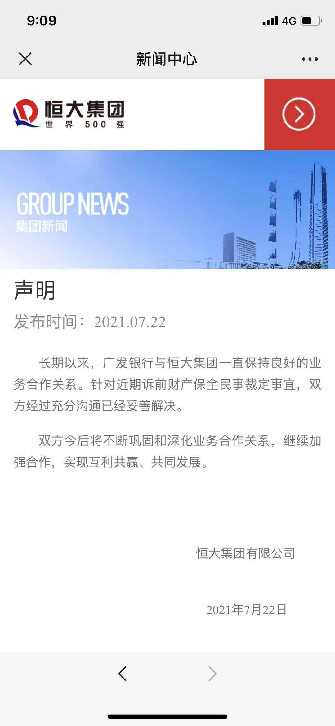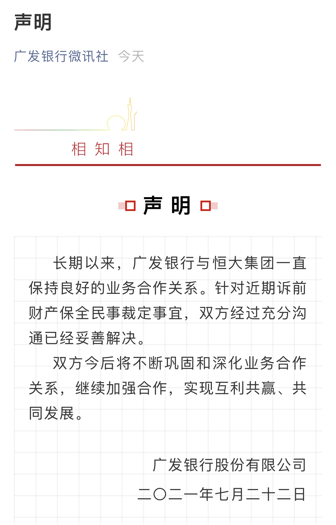 7月22日,广发银行与恒大集团同时发布声明称,双方已就近期的诉前保全事宜达成和解。