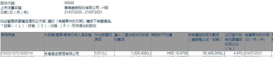 智通财经APP获悉,香港联交所最新资料显示,7月19日,朱雀基金管理有限公司减持华泰证券(06886)102.94万股,每股作价10.87港元,总金额约为1118.96万港元。减持后最新持股数目为8540.60万股,最新持股比例为4.97%。