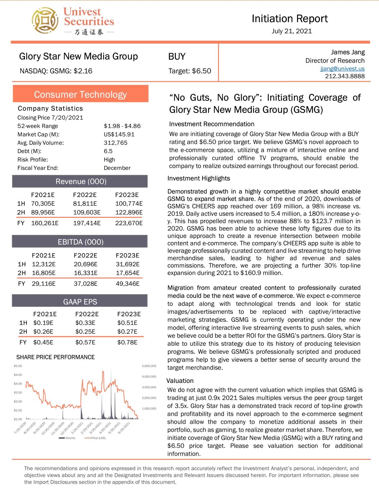 美国万通证券认为,耀世星辉当前的估值没有反应出公司在移动互联网内容生态赋能电商新消费方面上的独特价值,耀世星辉以其创新的“内容赋能新消费”的发展模式与市场上的竞争者,包括电商领域的头部玩家形成错位竞争。公司独特的互动流媒体平台“悦享视频”和移动互联网视频内容相融合,以促进其悦享商城的GMV增长,这也将使耀世星辉在2021年及未来多年始终保持强劲的增长。
