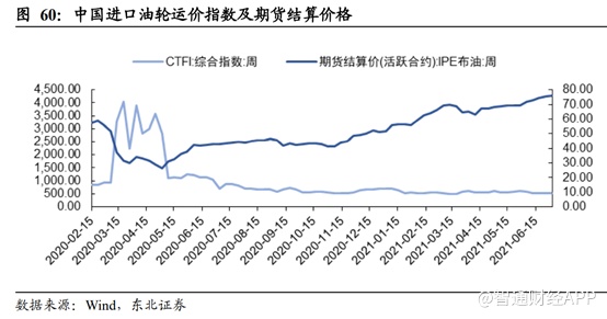 油运价格跟原油价格强相关,油价上涨往往意味着原油紧缺,运力将大于供给导致油运价格下跌。2020 年春节期间新冠疫情影响全球经济失速,对原油需求下滑导致运价下跌。去年3 月沙特宣布增产,原油价格暴跌,全球主要国家开始囤油行动,CTFI 指数大幅提升;随后OPEC+达成减产协议,沙特也自愿每月减产100万桶,油价开始企稳回升,CTFI冲高回落。