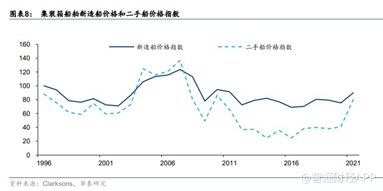 截至6 月30 日, 全球集装箱新造船订单占比现有运力比重为 18.4%,较 2020 年初的 10.7%大幅上升。船舶资产价格方面,7月Clarksons集装箱新造船价格和二手船价格指数分别为90点和80点,同比上涨 16%和128%。