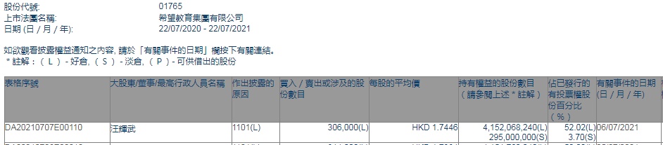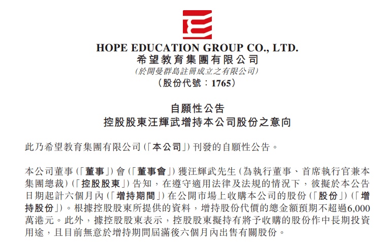 据悉,希望教育此前曾公告CEO汪辉武有意向自5月7日起6个月内增持公司股份,总金额不超过6000万港元,且无意于增持期间届满后六个月内出售有关股份。