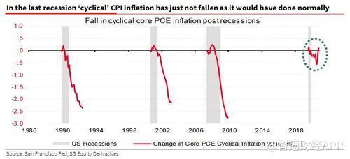 此外,在旧金山联储最近发表的一篇文章中,该文章将核心PCE通胀分为周期性部分和非周期性。下图显示了美国经济衰退后三年内周期性核心PCE通胀的累积变化。而这一次是不同的,及时的货币/财政支持的组合已经打断了周期规律。通常情况下,在美国前三次衰退开始后的15个月,周期性核心PCE下降了0.5%至1.5%,而这次则高于衰退前的水平。