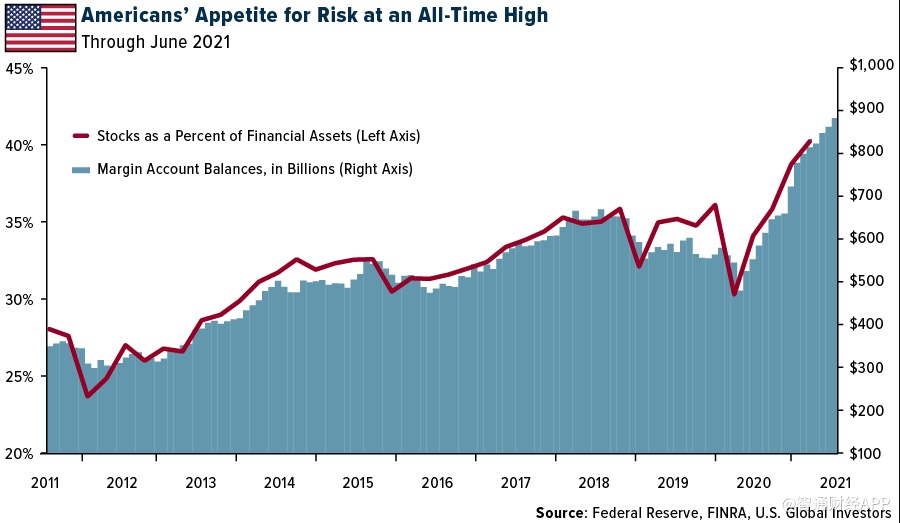 看看下面的图表。 美国投资者的风险偏好处于历史最高水平。 股票占家庭金融资产的比例首次超过40%。 更重要的是,美国人正积极进行保证金交易。 截至6月底,保证金账户总额达到了前所未有的8820亿美元,较上年同期增长了50%。