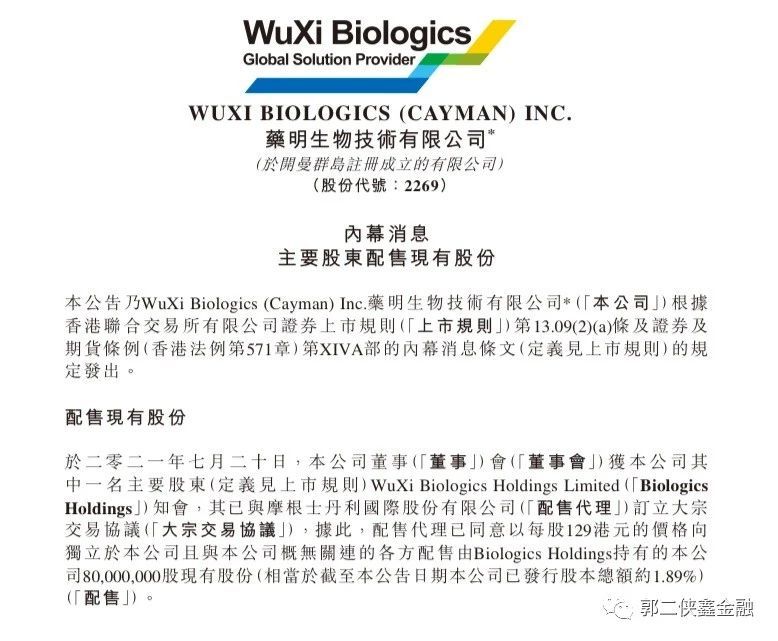 2021年7月20日,药明生物(02269)公布,大股东WuXiBiologicsHoldingsLimited(无锡生物控股有限公司),以每股129港元的价格配售8000万现有股份(相当于公司已发行股本总额约1.89%)。